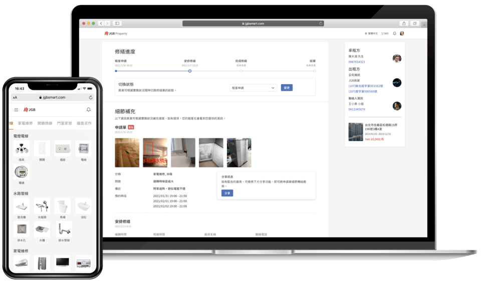 原本我都是需要騎車過去租屋處,到場處理很多事情,現在女兒推薦我用這個JGB之後,功能簡單不複雜,用了一陣子真的省下我很多時間。以後不管是收租、退租、修繕,通通在網路上解決。科技真的太強大了。